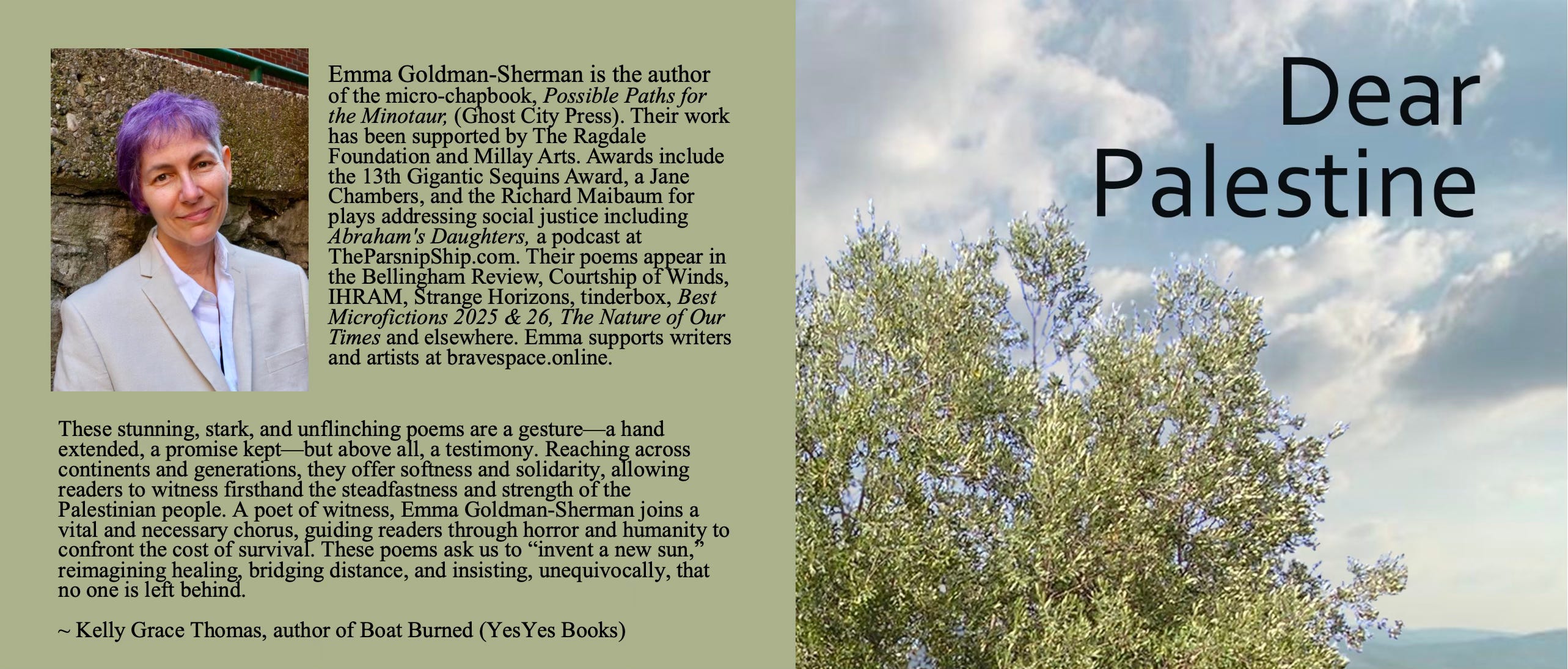I’m on my way to Baltimore to attend AWP, a conference for all kinds of writers and publishers, hoping to meet and connect with other people concerned with the state of the world. I’ll be reading some of my work, including microfiction anthologized in Best Microfiction 2026, judged by poet Diane Seuss, and poems from my chapbook Dear Palestine.