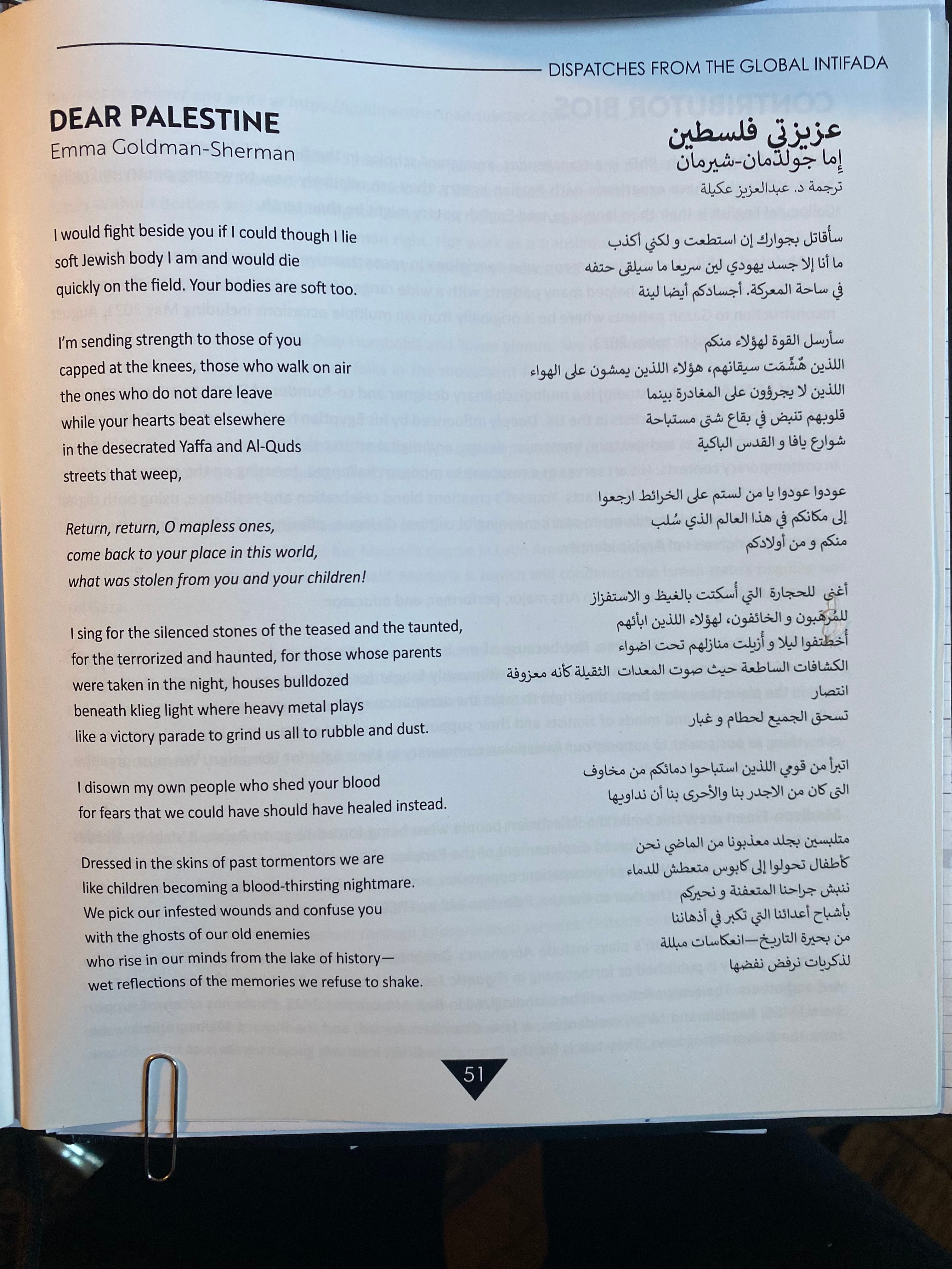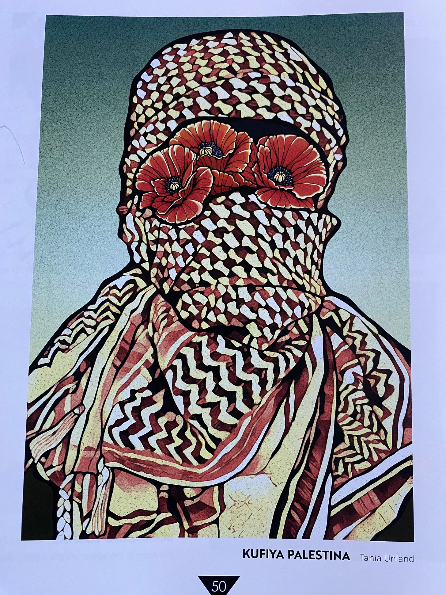 Dear Palestine begins with the title poem. First published in Toyon Issue 71, Dispatches from the Global Intifada, Dear Palestine was the last poem in the issue, published in the Spring of 2025. Here’s the artwork from the facing page called Kufiya Palestina by Tania Unland. The Arabic translation is by Dr. Abdulaziz Akila. If you want to hear the editor’s notes or other selections from the issue performed, this link will take you to more.